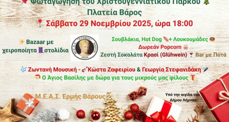 Φωταγώγηση του Χριστουγεννιάτικου Πάρκου στην Πλατεία του Βάρους Η μαγεία των Χριστουγέννων έρχεται στη Λήμνο!…