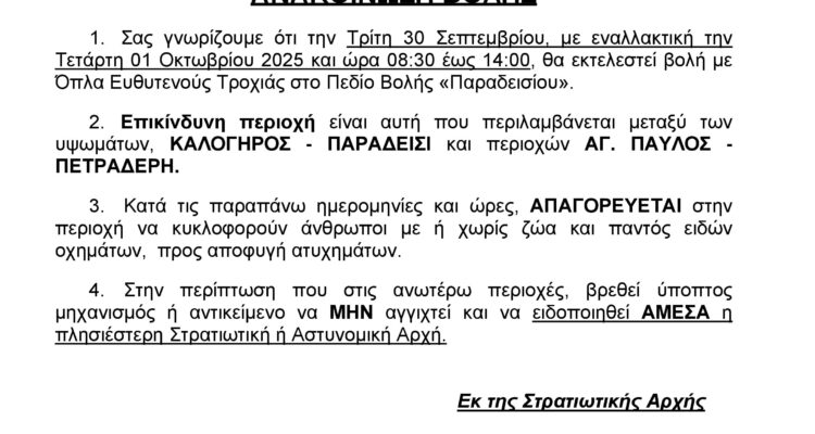 Εκτέλεση βολής της 130 ΣΜ στο πεδίο βολής "ΠΑΡΑΔΕΙΣΙΟΥ" θα πραγματοποιηθεί την Τρίτη 30 Σεπτεμβρίου…