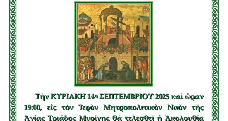 Την Κυριακή 14 Σεπτεμβρίου, στις 19:00, στην Αγία Τριάδα στη Μύρινα θα τελεστεί η Ακολουθία…
