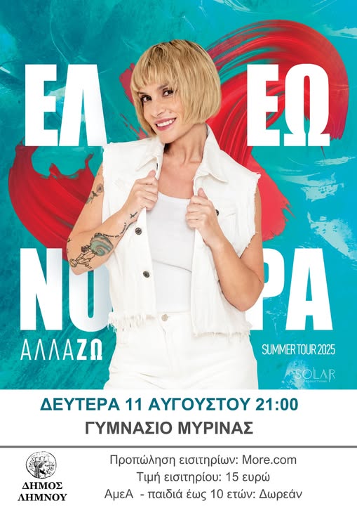 Η Ελεωνόρα Ζουγανέλη με ανεβασμένη, ξέγνοιαστη διάθεση έρχεται κοντά μας στις 11 Αυγούστου, στις 21:00, στο Γυμνάσιο Μύρινας, σε μία μουσική παράσταση με διοργανωτή τον Δήμο Λήμνου.
