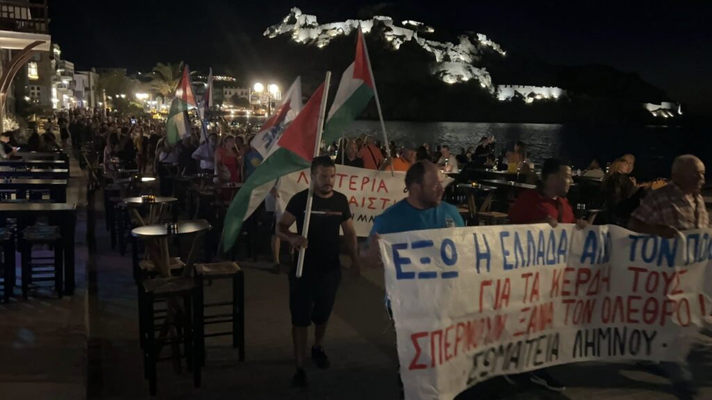 Μαζική συγκέντρωση και πορεία αλληλεγγύης στον Αγωνιζόμενο Παλαιστινιακό λαό στη Μύρινα Λήμνου, με τη συμμετοχή και της ΕΛΜΕ Λήμνου και Αγ. Ευστρατίου.