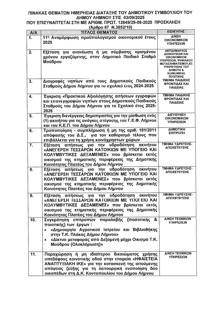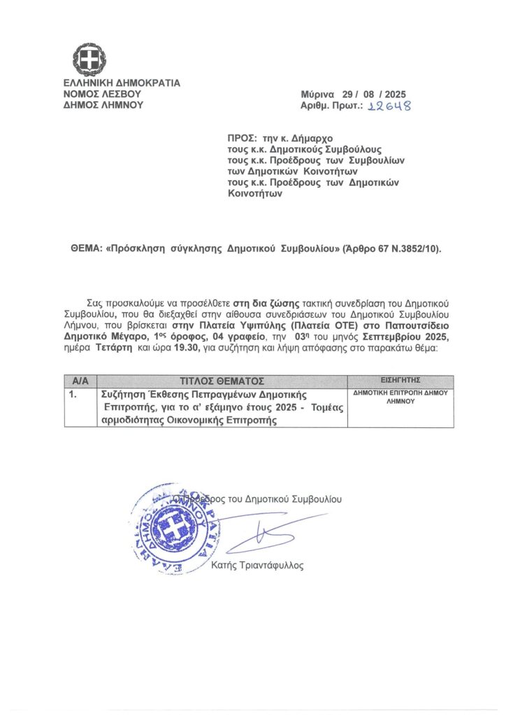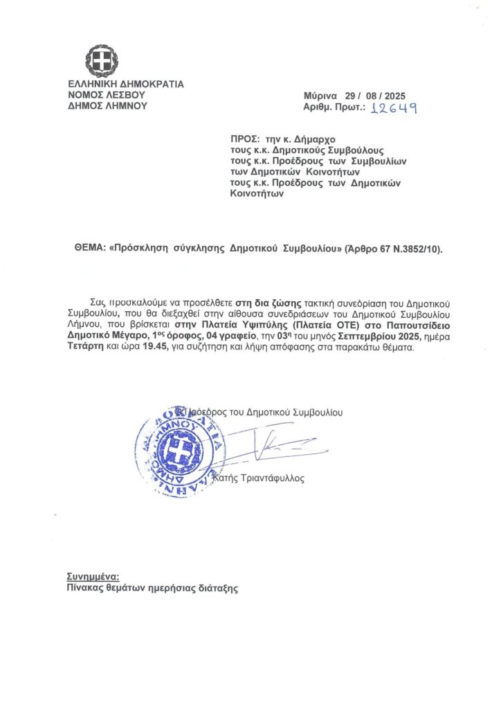 ΠΡΟΣΚΛΗΣΕΙΣ ΓΙΑ ΤΑΚΤΙΚΕΣ ΣΥΝΕΔΡΙΑΣΕΙΣ ΤΟΥ ΔΗΜΟΤΙΚΟΥ ΣΥΜΒΟΥΛΙΟΥ ΣΤΙΣ 3 ΣΕΠΤΕΜΒΡΙΟΥ ΗΜΕΡΑ ΤΕΤΑΡΤΗ