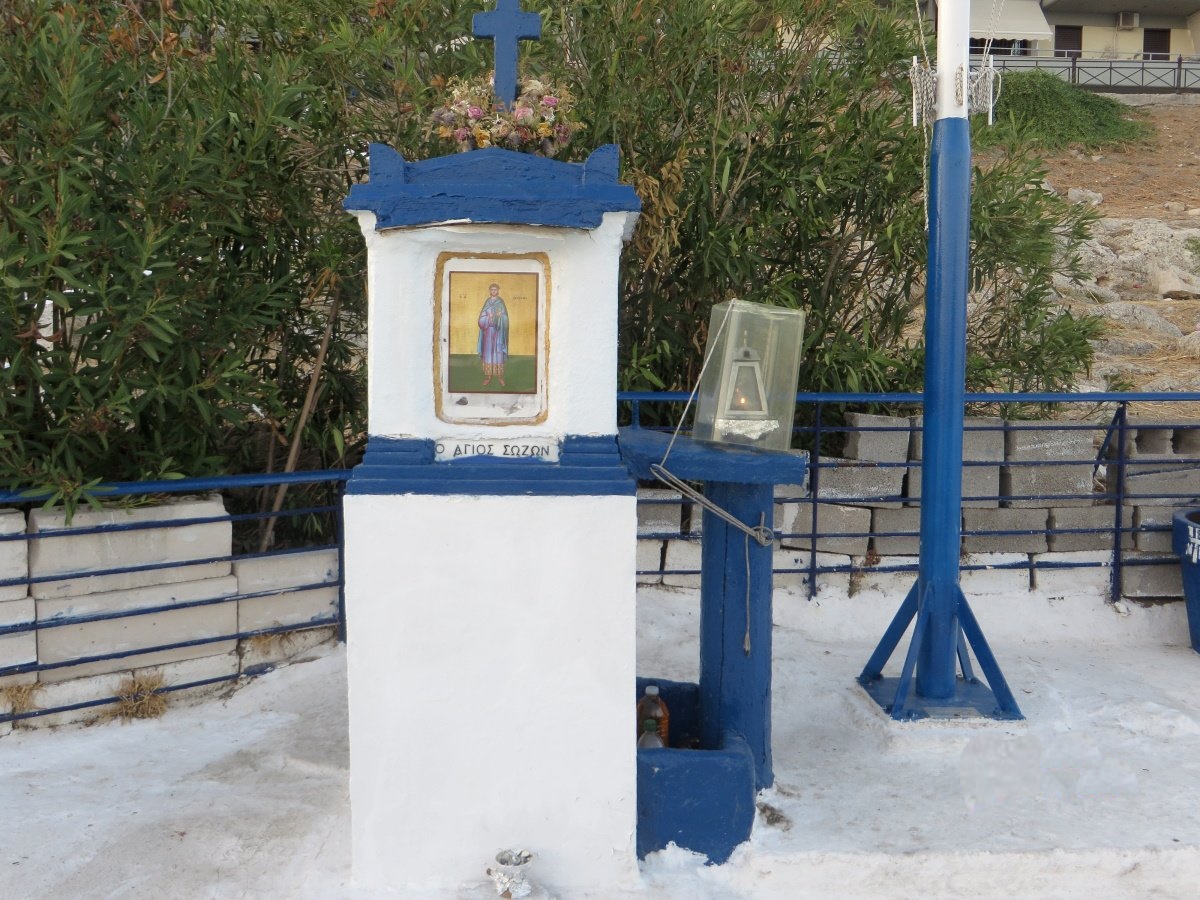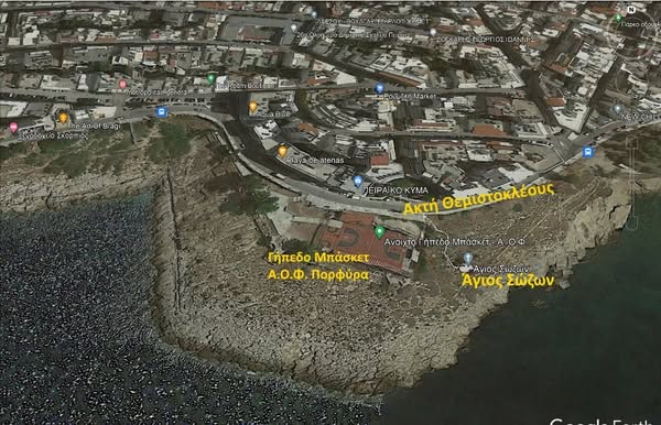 Το εκκλησάκι του Αγ. Σώζοντος είναι δίπλα στο ανοιχτό γήπεδο μπάσκετ του Α.Ο.Φ. Πορφύρα στον Πειραιά.