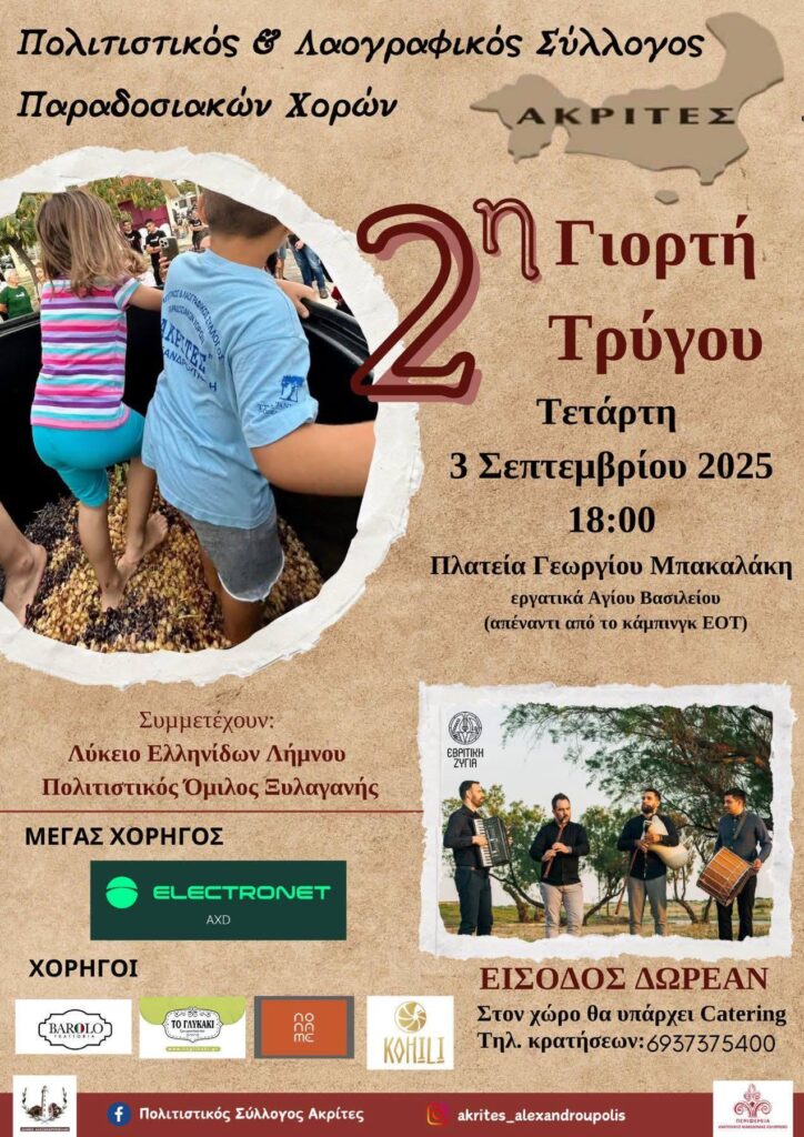 Μέλη της εφηβικής του ομάδας θα ταξιδέψουν στην Αλεξανδρούπολη για την 2η Γιορτή Τρύγου που διοργανώνει ο Πολιτιστικός και Λαογραφικός Σύλλογος “Ακρίτες”.