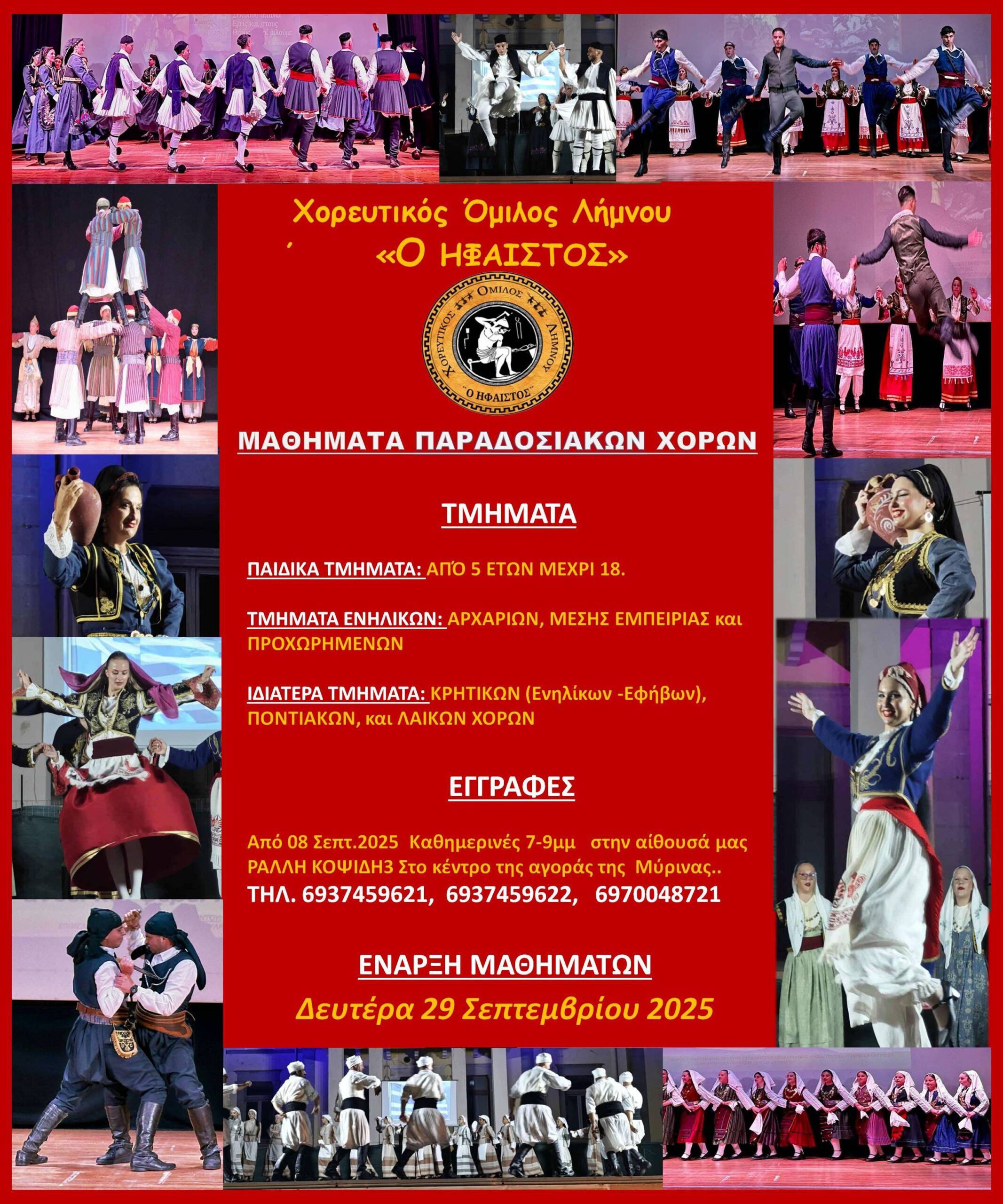 Η έναρξη των μαθημάτων θα γίνει τη Δευτέρα 29 Σεπτεμβρίου 2025 και όπως συνηθίζουμε κάθε χρόνο ξεκινάμε πάντα με ένα γλέντι γνωριμίας παλιών και νέων μελών μας.