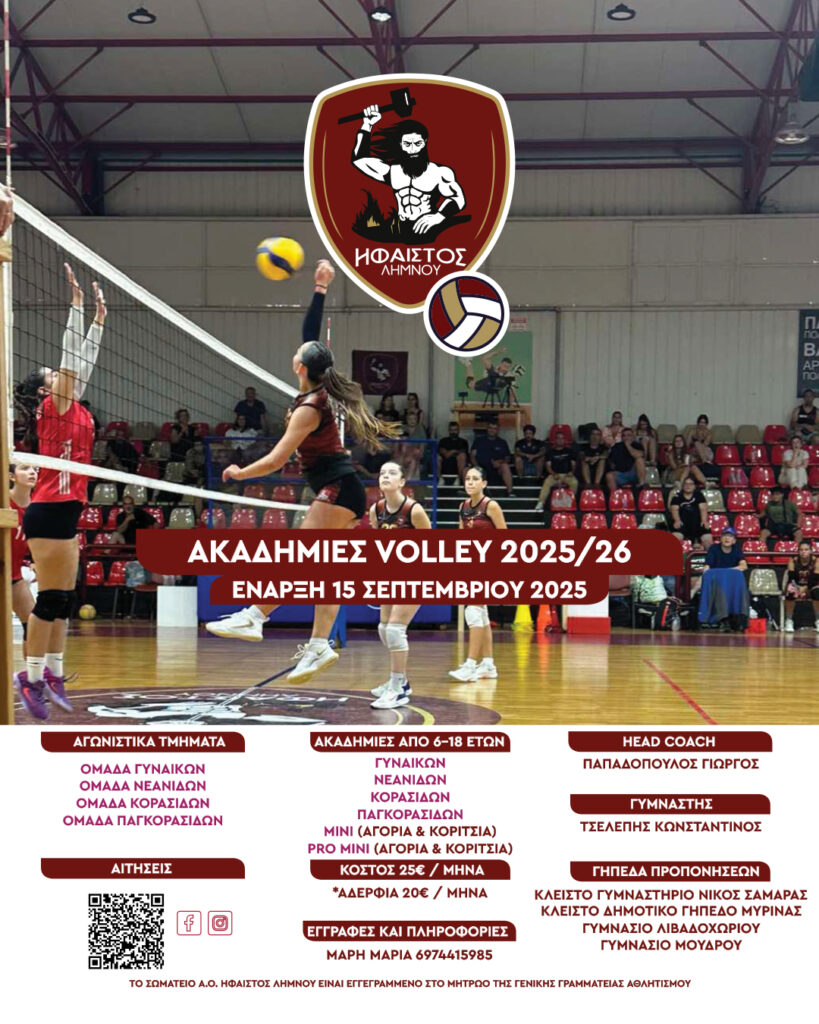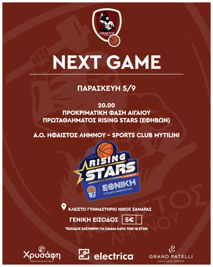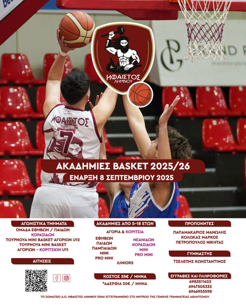 Ο πρώτος αγώνας του Ήφαιστου Λήμνου για την Προκριματική φάση του Πρωταθλήματος Αιγαίου Καλαθοσφαίρισης Εφήβων είναι αυτή την Παρασκευή 5/9, ενώ ξεκινούν και οι ακαδημίες μπάσκετ και βόλεϊ του Ηφαίστου.