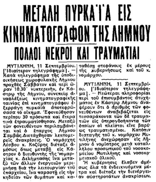 Ο μεγάλος Λήμνιος εικαστικός και συγγραφέας Ράλλης Κοψίδης έχει καταγράψει με τον δικό του ιδιαίτερο τρόπο πώς θυμάται την μεγάλη συμφορά που βρήκε το νησί μας εκείνη την αποφράδα ημέρα με τα τρία (ή τέσσερα) εννιάρια, 9/9/1939 ώρα 9μμ, όταν κάηκε ο κινηματογράφος, όπου για πρώτη φορά προβαλλόταν τότε στο νησί ή ομιλούσα ταινία “Ave Maria“! Ο Ράλλης Κοψίδης ήταν τότε δέκα χρονών (γεννήθηκε το 1929 ). Από το βιβλίο του «Κάστρο Ηλιόκαστρο» 1980 διαβάζουμε: