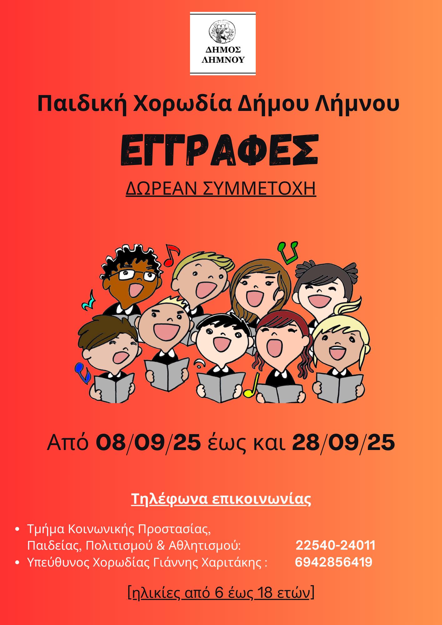 Ο Δήμος Λήμνου, ανακοινώνει τις εγγραφές νέων μελών για την παιδική χορωδία του, που απευθύνεται σε παιδιά ηλικίας 6 έως 18 ετών.