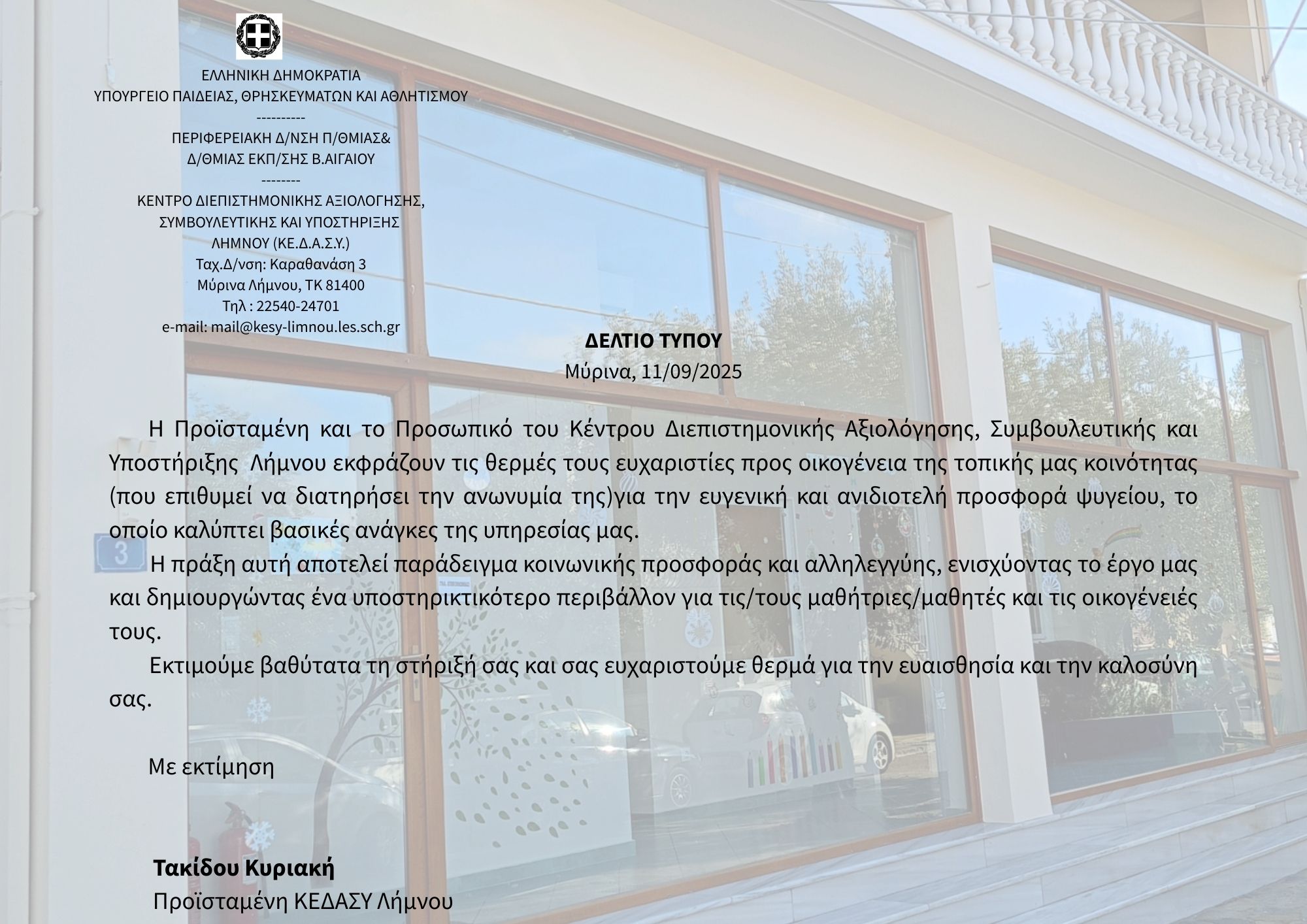 ΕΥΧΑΡΙΣΤΗΡΙΟ ΤΟΥ ΚΕΔΑΣΥ ΛΗΜΝΟΥ