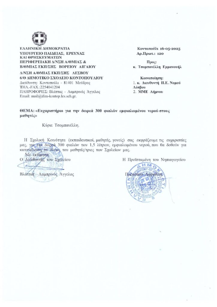 Η Σχολική Κοινότητα Κοντοπουλίου ευχαριστεί τον κ. Εμμανουήλ Τσομπανέλλη για την προσφορά 300 φιαλών νερού.