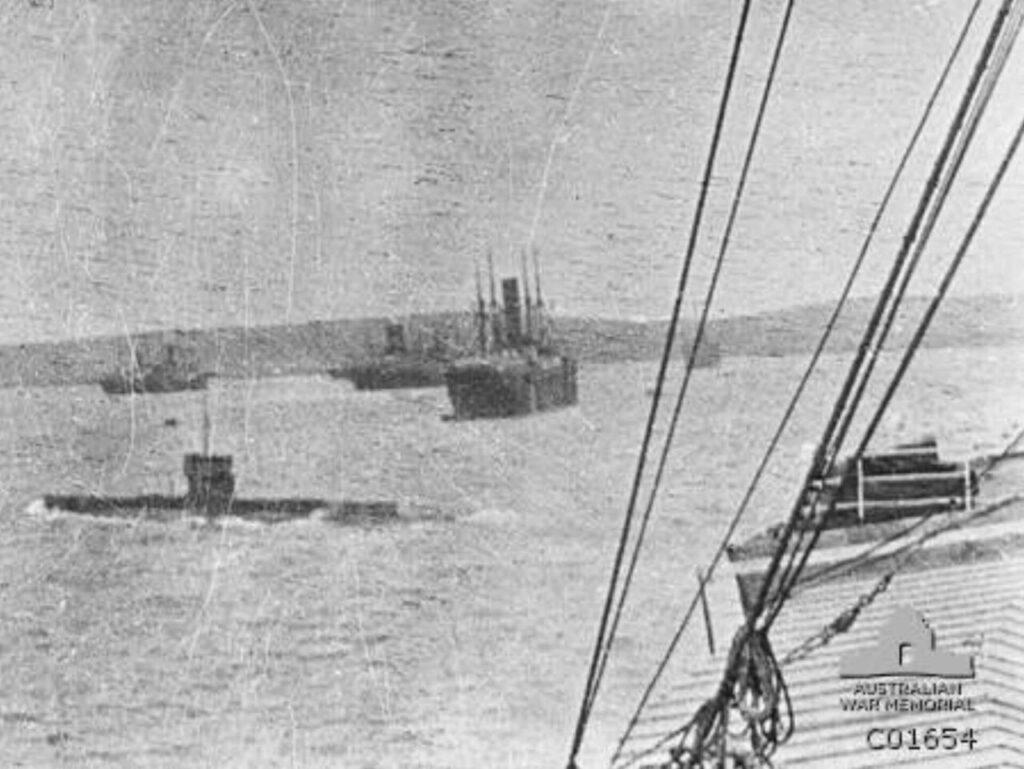 Το υποβρύχιο του Βασιλικού Αυστραλιανού Ναυτικού AE2 στον κόλπο του Μούδρου κατά τη διάρκεια της εκστρατείας στην Καλλίπολη το 1915. Φωτογραφία: AWM