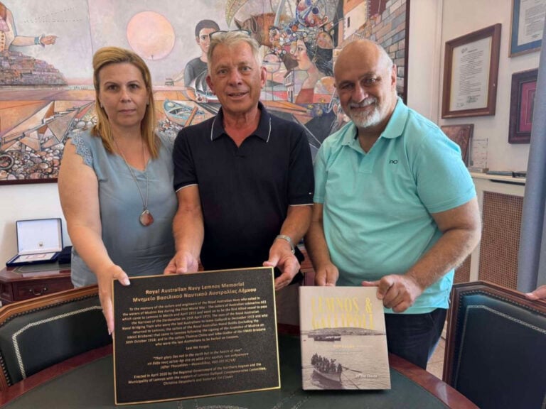 Μια νέα αναμνηστική πλακέτα προς τιμήν της προσφοράς του Βασιλικού Αυστραλιανού Ναυτικού (RAN) στη Λήμνο κατά την εκστρατεία της Καλλίπολης το 1915-’16 παρουσιάστηκε πρόσφατα στις τοπικές Αρχές του νησιού.