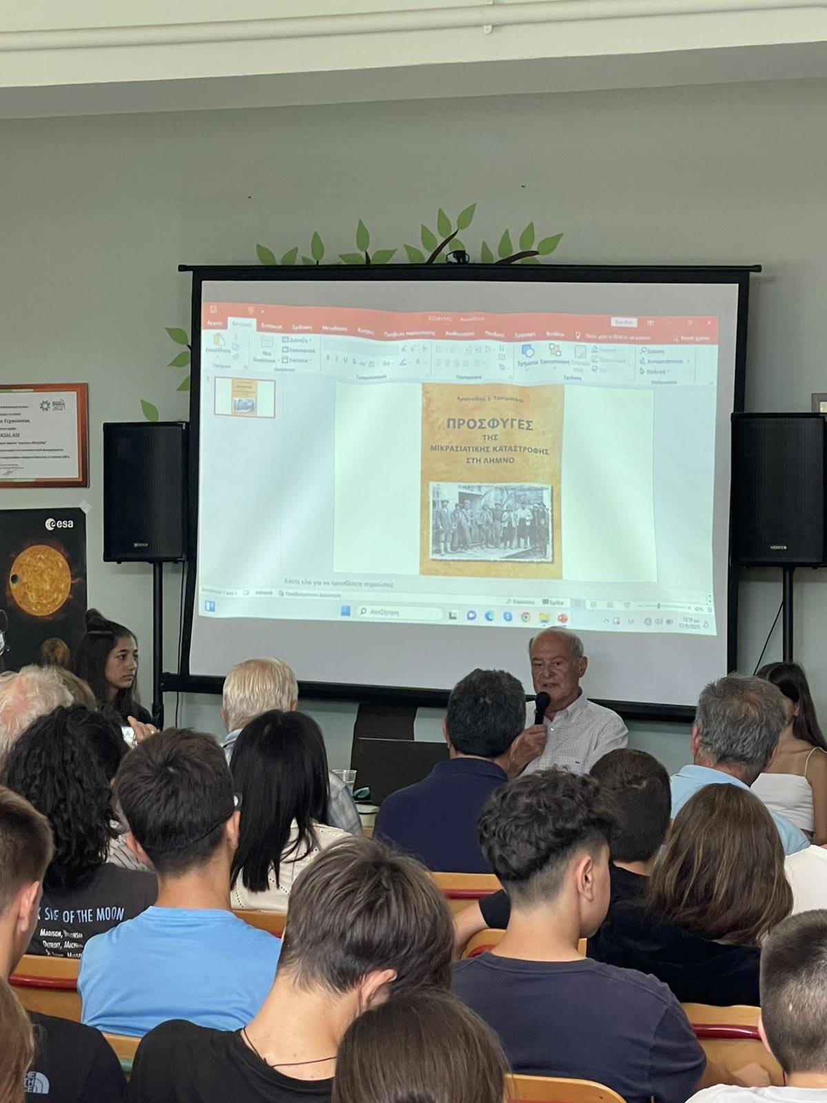 Την Τετάρτη 17 Σεπτεμβρίου 2025 είχαμε την τιμή και χαρά να φιλοξενήσουμε στο σχολείο μας τον ιστορικό συγγραφέα κ. Αριστείδη Τσοτρούδη, ο οποίος παρουσίασε το νέο του βιβλίο “Πρόσφυγες της Μικρασιατικής καταστροφής στη Λήμνο”.