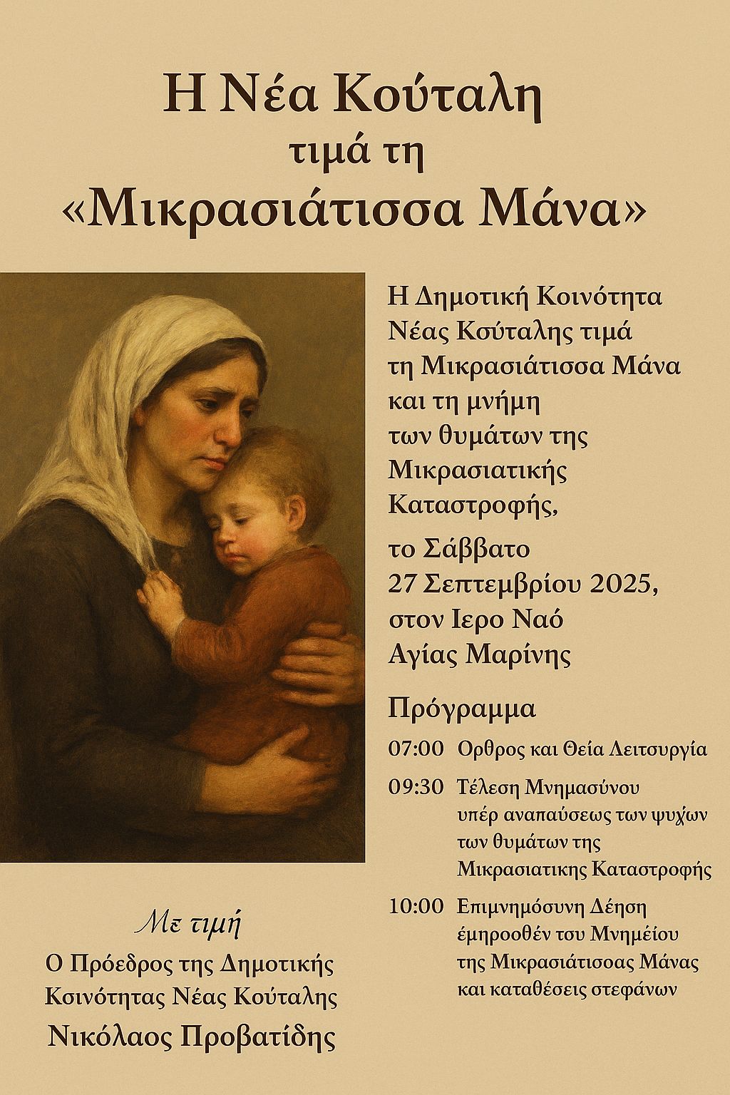 Η Κοινότητα Νέας Κούταλης σας προσκαλεί με σεβασμό και συγκίνηση στην εκδήλωση μνήμης για τη Μικρασιάτισσα Μάνα