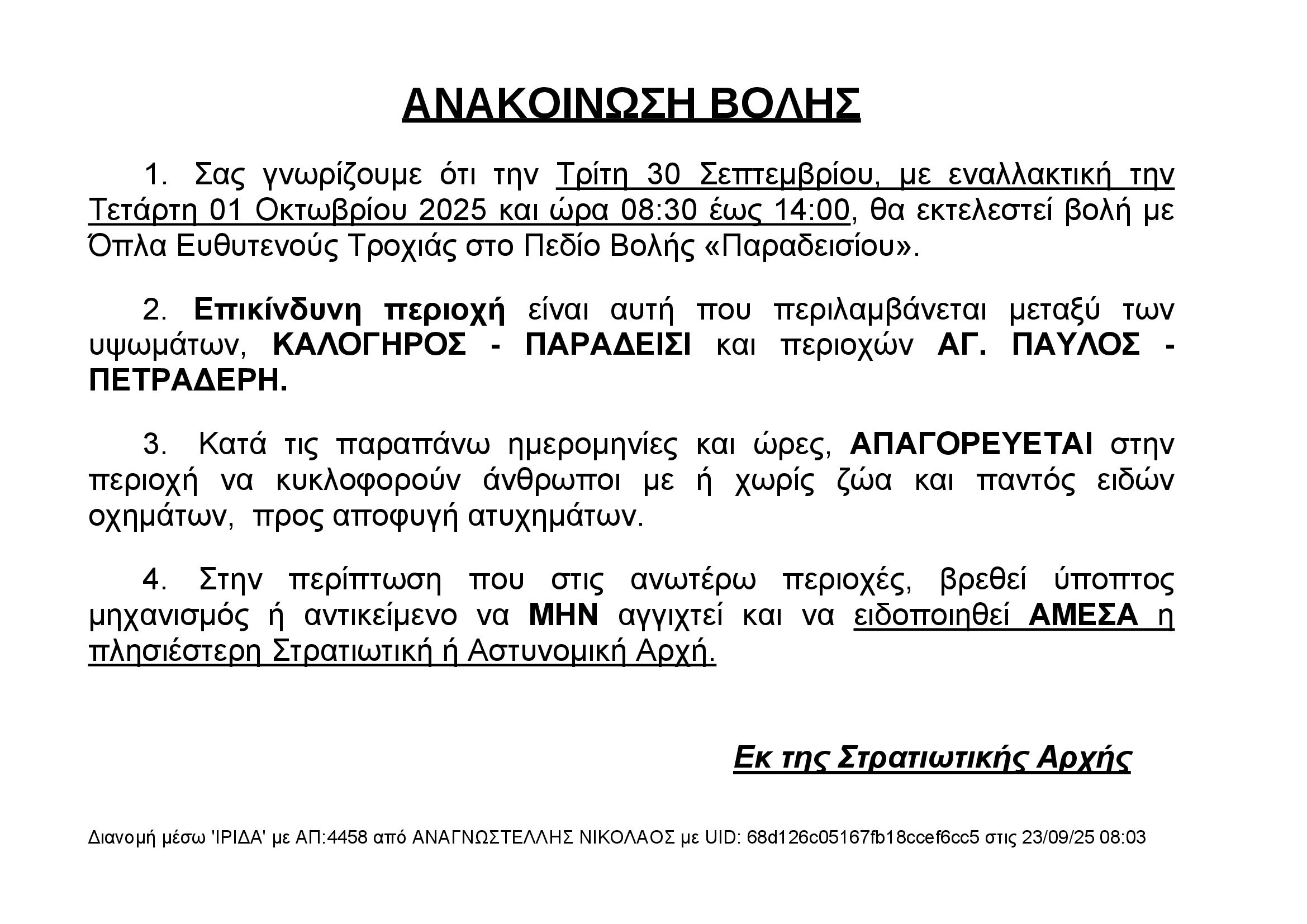 Εκτέλεση βολής της 130 ΣΜ στο πεδίο βολής “ΠΑΡΑΔΕΙΣΙΟΥ” θα πραγματοποιηθεί την Τρίτη 30 Σεπτεμβρίου 2025.