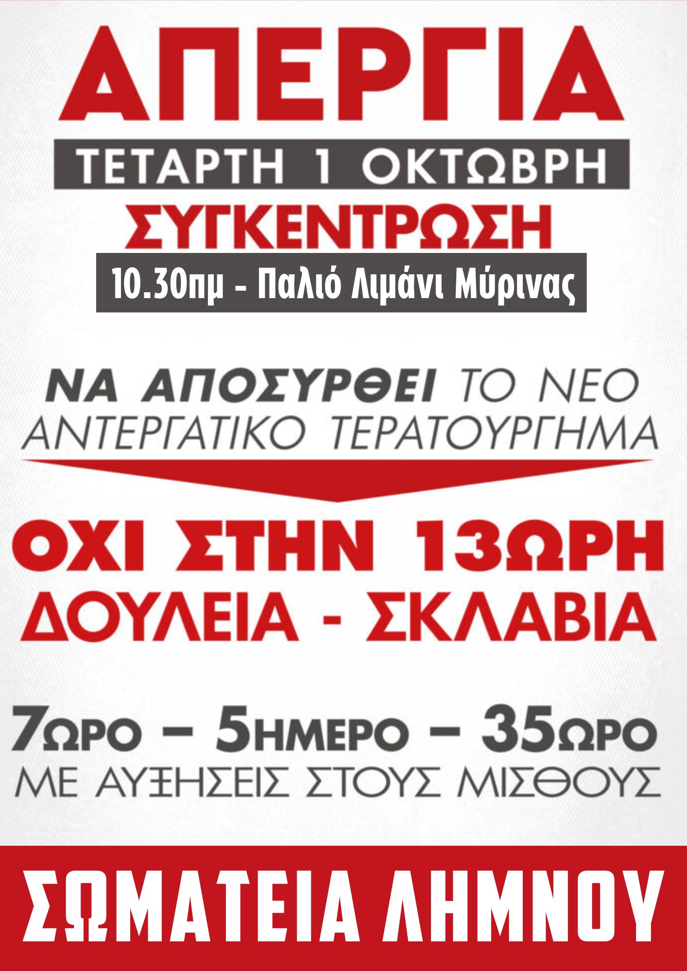 Όλοι στην απεργιακή συγκέντρωση στο λιμάνι της Μύρινας στις 10.30 π.μ.
