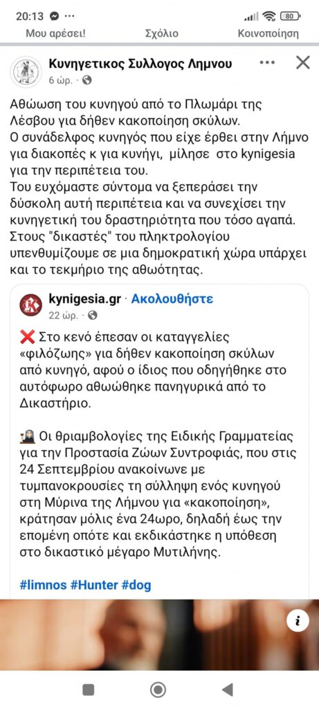 Θυμίζουμε πως όλα ξεκίνησαν από καταγγελία δύο πολιτών που όπως υποστήριξαν ο κυνηγός για περισσότερες από δύο ώρες είχε αφήσει μέσα στα κουτιά κάτω από τον ήλιο τα σκυλιά του. Η αστυνομία βρέθηκε στο σημείο , κατέγραψε το περιστατικό, ενημέρωσε την εισαγγελία και ακολούθησε το δελτίο τύπου :”Συνελήφθη ημεδαπός στη Λήμνο, κατηγορούμενος για κακομεταχείριση ζώων”…. Από χθες όμως τα δεδομένα άλλαξαν όπως ήδη έχουμε αναφέρει,και η περιπέτεια του ο 31χρονου κυνηγού είχε αίσιο τέλος. *Να σημειωθεί ότι δεν υπήρξε νεότερο δελτίο τύπου και οι πληροφορίες βασίζονται στο ρεπορτάζ μας. Επίσης ανακοίνωση σχόλιο υπήρξε από τον κυνηγετικό Σύλλογος και το σάιτ kynigesia