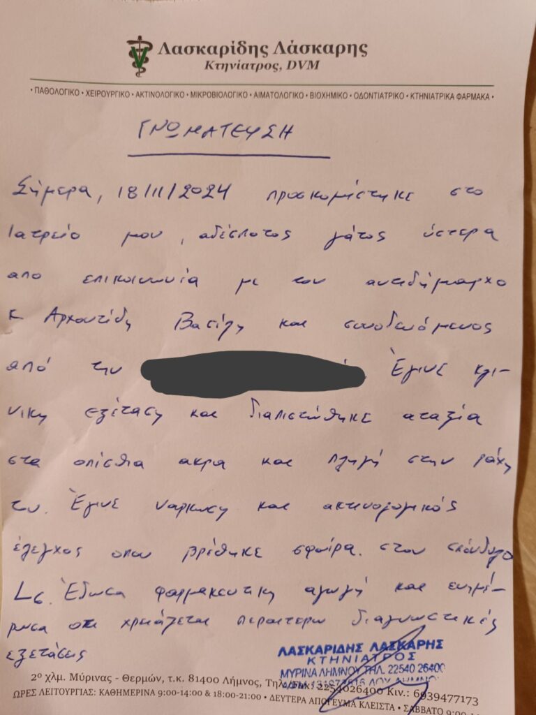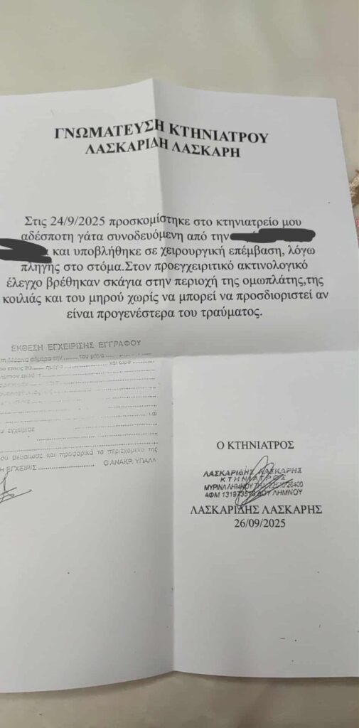 Όπως μας πληροφορεί κάτοικος που ανέλαβε την περίθαλψη του ζώου χρειάστηκε να χειρουργηθεί, αφού είχε πληγή στο στόμα και όπως έδειξε η ακτινογραφία μέσα στην κοιλιά και στον μηρό βρέθηκαν σκάγια. Τώρα το ζώο αναρρώνει ωστόσο στις 18 /11/24 πάλι υπήρξε τραυματισμός με σκάγια όπως έδειξαν και οι ακτινογραφίες, όμως δυστυχώς το ζώο μετά απ’ λίγο καιρό δεν τα κατάφερε! Υπάρχει μεγάλη ανησυχία και δικαιολογημένα μήπως επαναληφθούν οι απόπειρες θανάτωσης από κάποιον ή κάποιους που έχου. βάλει σκοπό την εξολόθρευση των γάτων.