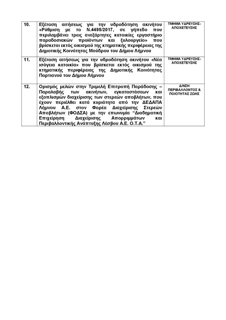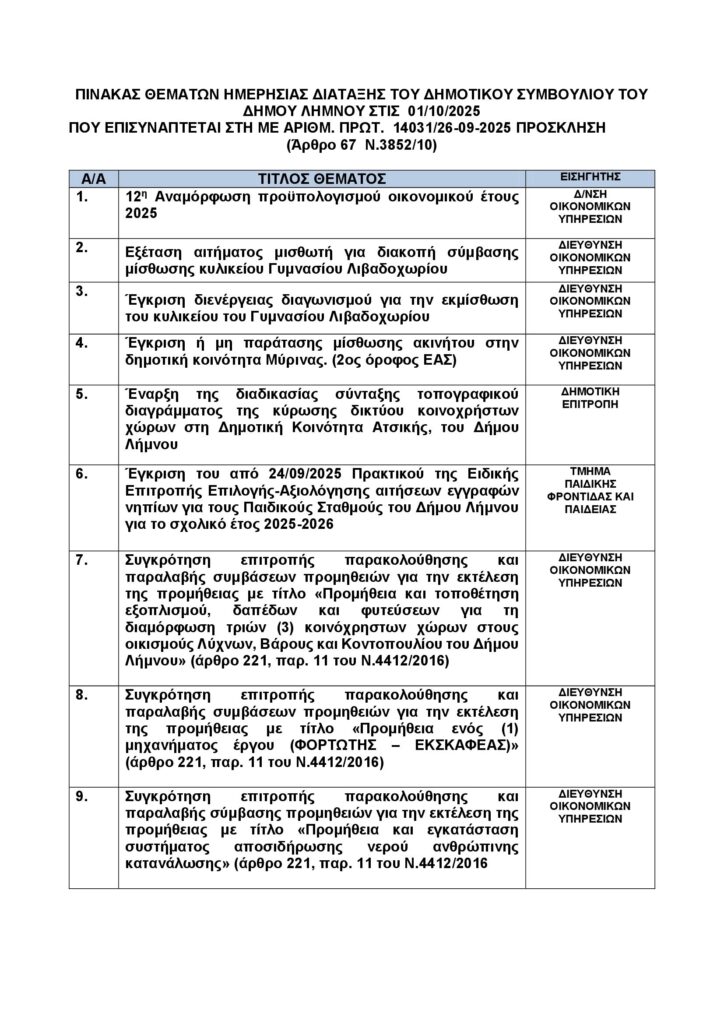 Τακτική συνεδρίαση του Δημοτικού Συμβουλίου, θα διεξαχθεί στην αίθουσα συνεδριάσεων του Δημοτικού Συμβουλίου Λήμνου, που βρίσκεται στην Πλατεία Υψιπύλης (Πλατεία ΟΤΕ) στο Παπουτσίδειο Δημοτικό Μέγαρο, 1ος όροφος, 04 γραφείο, την 01η τουμηνός Οκτωβρίου 2025, ημέρα Τετάρτη και ώρα 18.30, για συζήτηση και λήψη απόφασης στα παρακάτω θέματα.