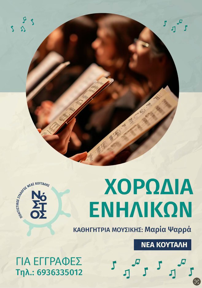 Ο Πολιτιστικός Σύλλογος Νέας Κούταλης “Νόστος” ανακοινώνει την έναρξη των μαθημάτων της Χορωδίας Ενηλίκων, κάθε Τετάρτη και ώρα 20:00, στο σχολείο της Νέας Κούταλης.
