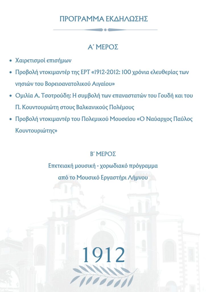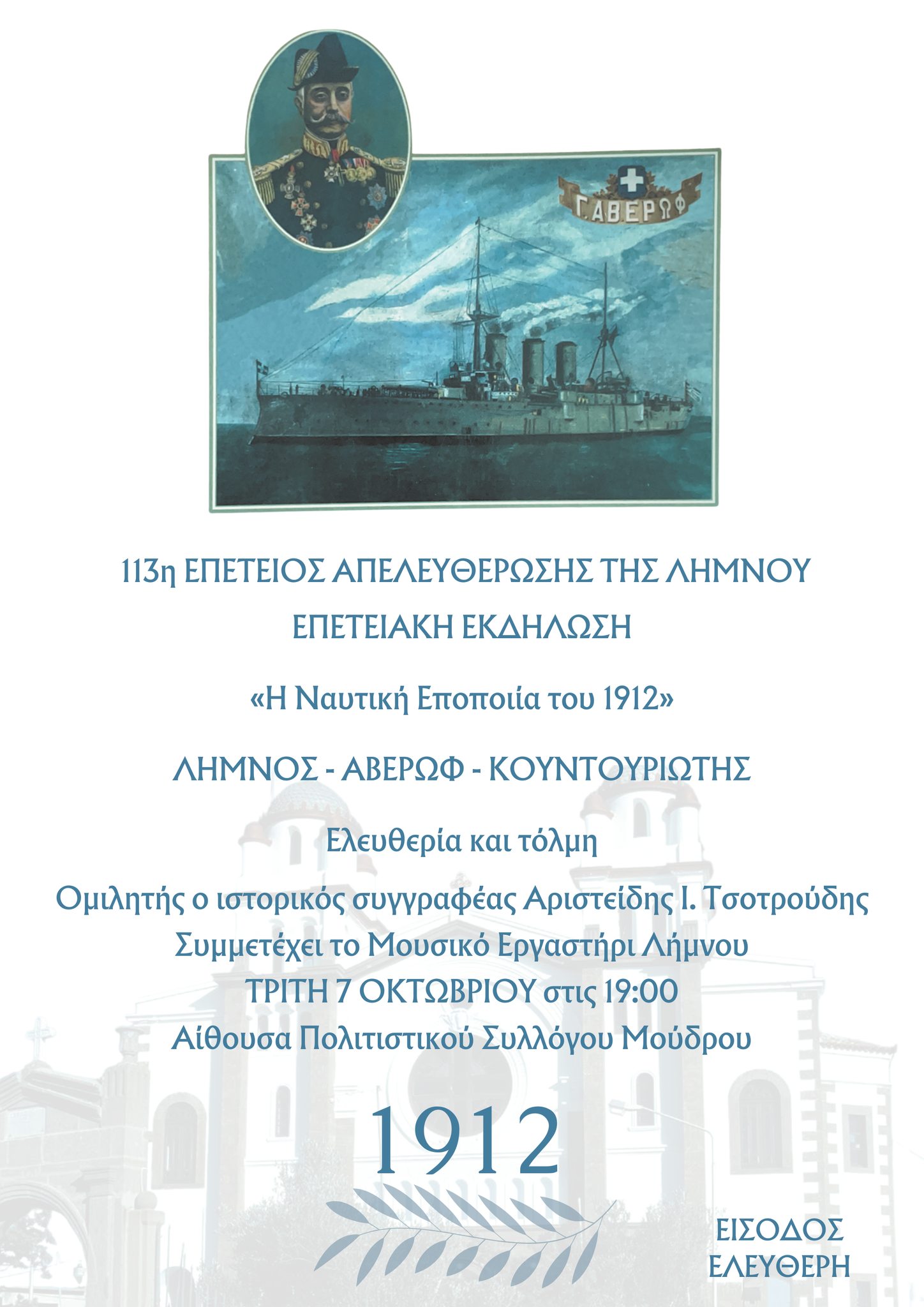 Στο πλαίσιο του εορτασμού των 113 χρόνων από την απελευθέρωση της Λήμνου, ο Δήμος Λήμνου διοργανώνει επετειακή εκδήλωση, με τίτλο «Η Ναυτική Εποποιία του 1912» ΛΗΜΝΟΣ – ΑΒΕΡΩΦ – ΚΟΥΝΤΟΥΡΙΩΤΗΣ: Ελευθερία και τόλμη, η οποία θα πραγματοποιηθεί την Τρίτη 7 Οκτωβρίου στις 19:00 στην αίθουσα του Πολιτιστικού Συλλόγου «Παύλος Κουντουριώτης», στον Μούδρο.