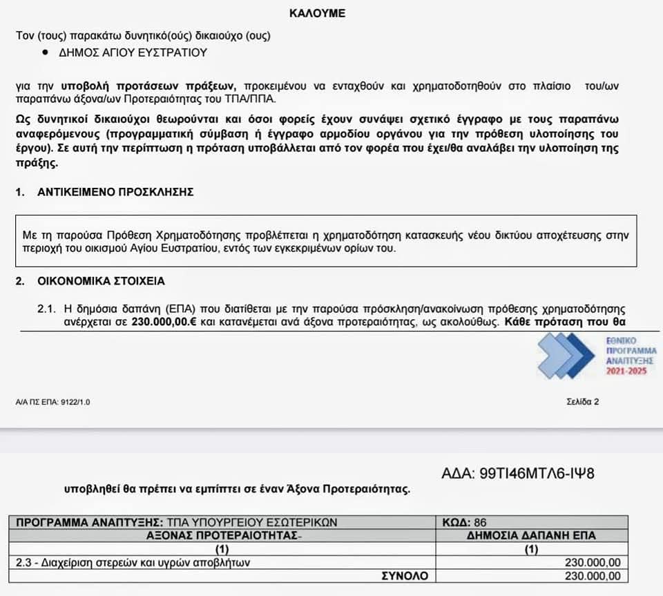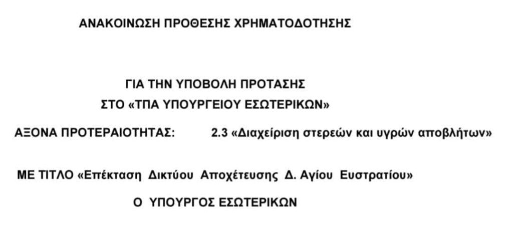 Είμαστε στην ευχάριστη θέση να ανακοινώσουμε στους συμπολίτες μας ακόμη μια χρηματοδότηση για το νησί μας που αφορά την επέκταση του δικτύου αποχέτευσης ύψους 230.000 ευρώ.