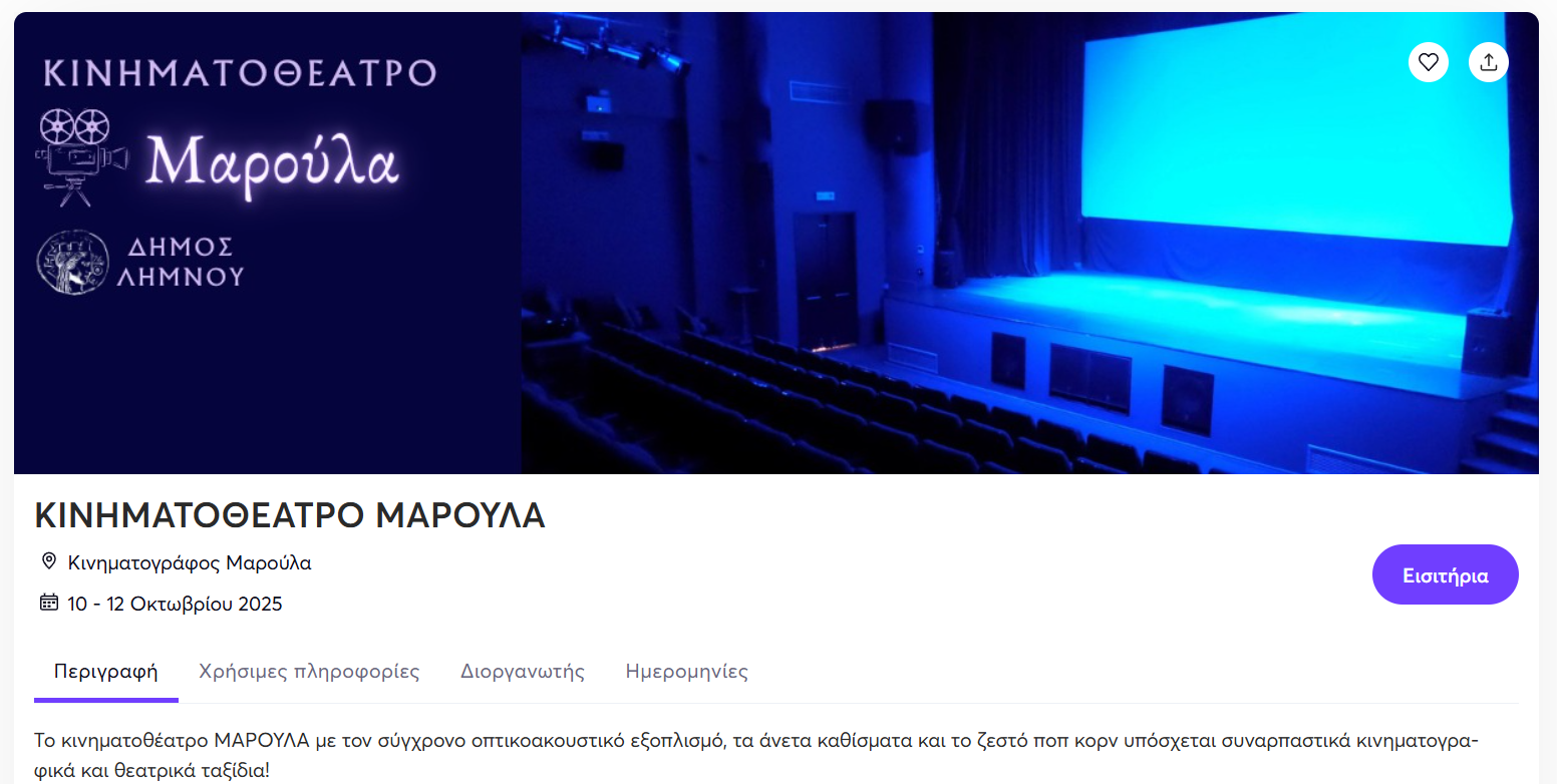Η Αντιδημαρχία Πολιτισμού σας ενημερώνει ότι πλέον μπορείτε να προμηθεύεστε ηλεκτρονικά τα εισιτήριά σας για ταινίες και εκδηλώσεις του «Μαρούλα» εύκολα και γρήγορα μέσω της πλατφόρμας more.com και συγκεκριμένα στην ηλεκτρονική διεύθυνση: