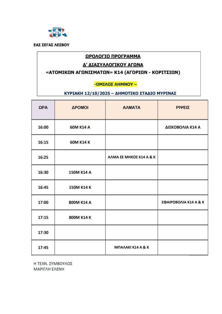 Η ΄Ενωση Αθλητικών Σωματείων ΣΕΓΑΣ Λέσβου σύμφωνα με τον αγωνιστικό της προγραμματισμό κλείνει τον κύκλο των διοργανώσεων της περιόδου 2025 και των Διασυλλογικών της αγώνων , με τον Δ΄ Αγώνα Κ-14 Αγοριών – Κοριτσιών «ΑΤΟΜΙΚΩΝ ΑΓΩΝΙΣΜΑΤΩΝ» που θα πραγματοποιηθεί σε δύο ομίλους όπως παρακάτω: