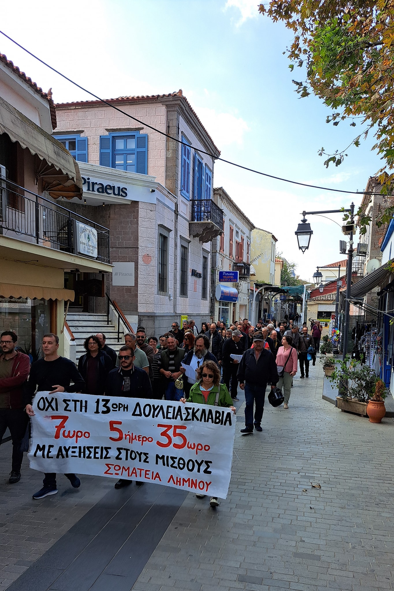 Στη συνέχεια ακολούθησε πορεία των συγκεντρωμένων απεργών μέσα από την αγορά της Μύρινας με τα συνθήματα να επικεντρώνονται στην ανάγκη να μπει φραγμός στα σχέδια της Κυβέρνησης να επιβάλει έναν πραγματικό εργασιακό Μεσαίωνα, με την κατάργηση του 8ωρου, την εφαρμογή της 13ωρης εργασίας και την περαιτέρω ελαστικοποίηση των σχέσεων εργασίας προς όφελος πάντα των εργοδοτών. Οι απεργοί έκαναν σαφές ότι το νομοσχέδιο για την 13ωρη εργασία, ακόμα κι αν ψηφιστεί, μπορεί και πρέπει να μείνει στα χαρτιά.