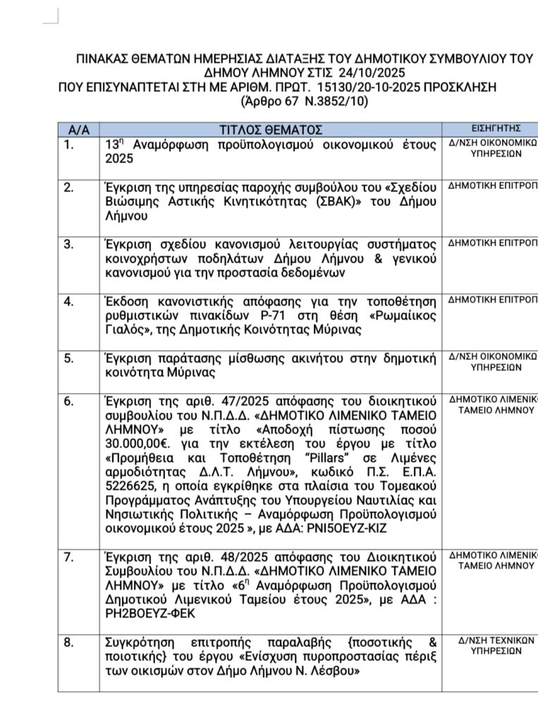 Σας προσκαλούμε να προσέλθετε στη δια ζώσης τακτική συνεδρίαση του Δημοτικού Συμβουλίου, που θα διεξαχθεί στην αίθουσα συνεδριάσεων του Δημοτικού Συμβουλίου Λήμνου, που βρίσκεται στην Πλατεία Υψιπύλης (Πλατεία ΟΤΕ) στο Παπουτσίδειο Δημοτικό Μέγαρο, 1ος όροφος, 04 γραφείο, την 24η του μηνός Οκτωβρίου 2025, ημέρα Παρασκευή και ώρα 18.00, για συζήτηση και λήψη απόφασης στα παρακάτω θέματα