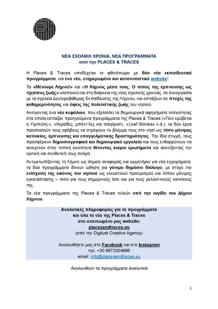 Η Places & Traces υπογράφει δύο νέα εκπαιδευτικά προγράμματα σε συνεργασία με τα σχολεία της Λήμνου!