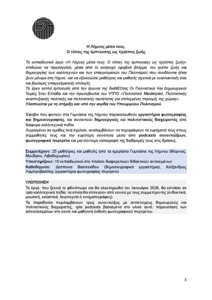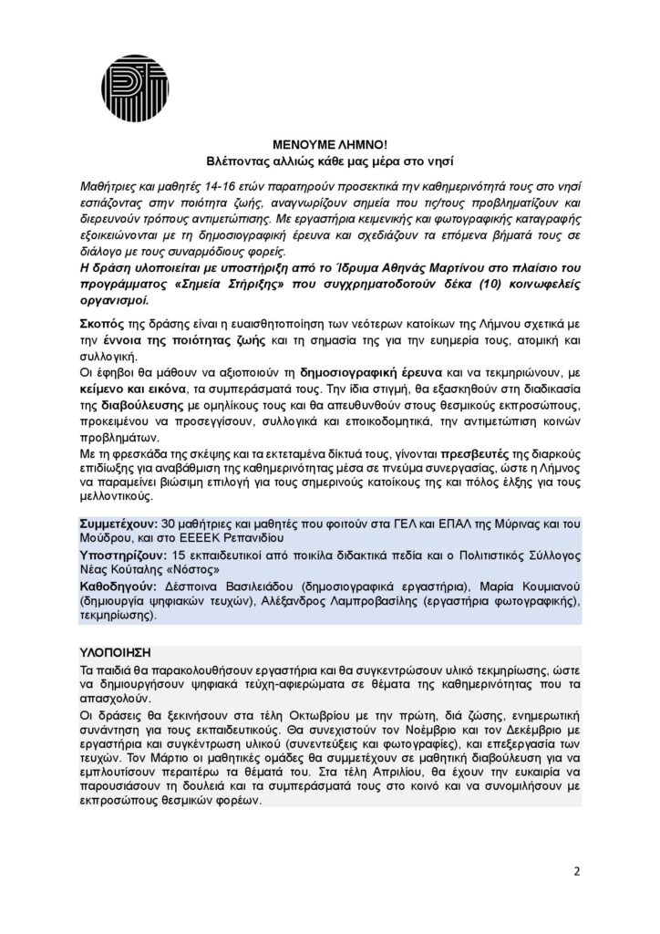 Με προσέγγιση δημοσιογραφική και διαθεματική, τα έργα “Μένουμε Λήμνο!» και «Η Λήμνος μέσα τους. Ο τόπος της έμπνευσης ως τ(ρ)όπος ζωής», ενεργοποιούν το ανήσυχο εφηβικό βλέμμα στρέφοντάς το στην καθημερινότητα και τη σύγχρονη πολιτιστική πραγματικότητα του νησιού.