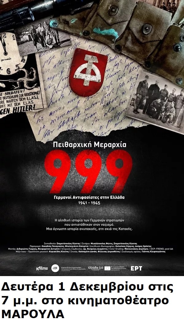 Επίσης, στα πλαίσια της επετείου της 28ης Οκτωβρίου, αλλά και της ημέρας της Εθνικής Αντίστασης στις 25 Νοεμβρίου, καλούμε όλες και όλους στην εκδήλωση και προβολή του ντοκιμαντέρ «Πειθαρχική Μεραρχία 999 – Γερμανοί Αντιφασίστες στην Ελλάδα 1941-1945», με αναφορά και στη Λήμνο, τη Δευτέρα 1 Δεκεμβρίου στις 7 μ.μ. στο κινηματοθέατρο ΜΑΡΟΥΛΑ.