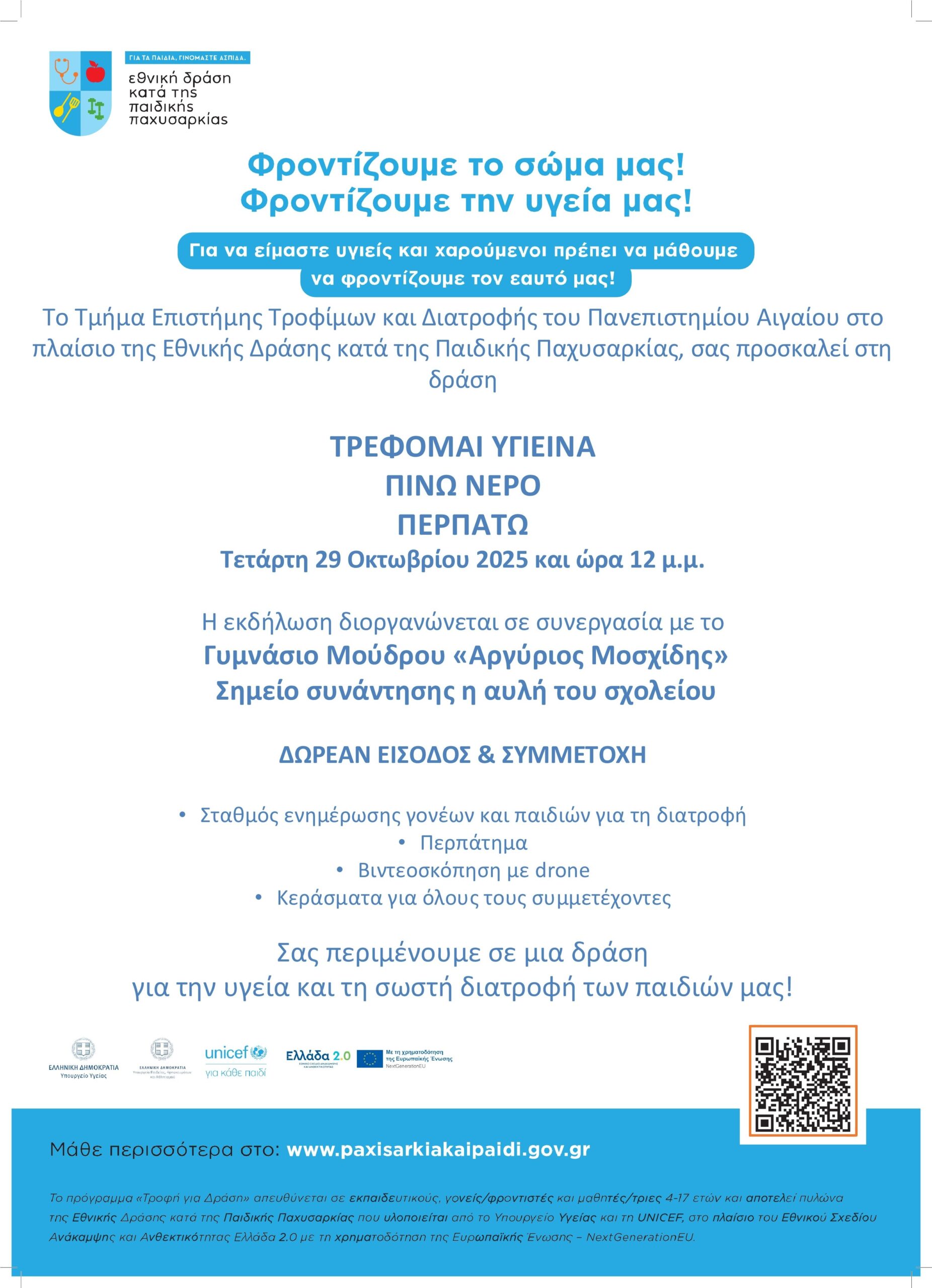 Το Τμήμα Επιστήμης Τροφίμων και Διατροφής του Πανεπιστημίου Αιγαίου στο πλαίσιο της Εθνικής Δράσης κατά της Παιδικής Παχυσαρκίας, σας προσκαλεί στη δράση