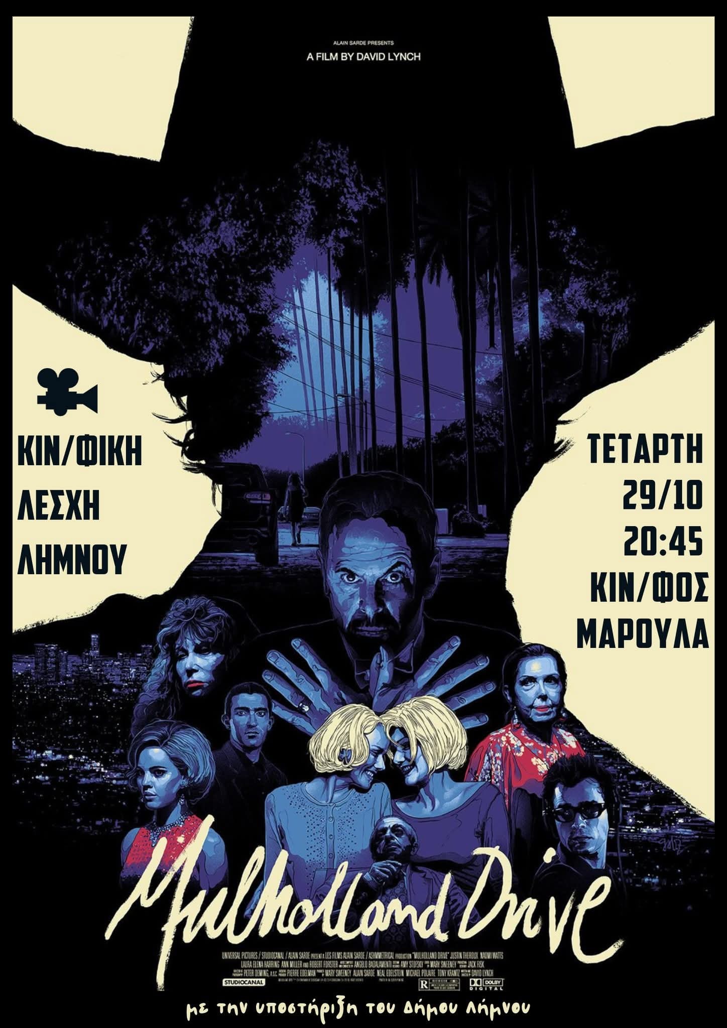 Οι προβολές της Κινηματογραφική Λέσχη Λήμνου συνεχίζονται και έχουμε τη μεγάλη χαρά να σας προσκαλούμε απόψε Τετάρτη 29 Οκτωβρίου στις 20:45 στο «Μαρούλα», για να παρακολουθήσουμε όλες και όλοι μαζί μια ακόμα υπέροχη ταινία. Αυτή τη φορά, επιλέξαμε να τιμήσουμε τον σπουδαίο Αμερικανό σκηνοθέτη Ντέιβιντ Λιντς, που έφυγε από τη ζωή τη χρονιά που διανύουμε, προβάλλοντας την κατά πολλούς κορυφαία ταινία του με τίτλο «Mulholland Drive» (Οδός Μαλχόλαντ).
