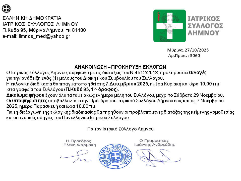 Ο Ιατρικός Σύλλογος Λήμνου προκηρύσσει εκλογές στις 7 Δεκεμβρίου.