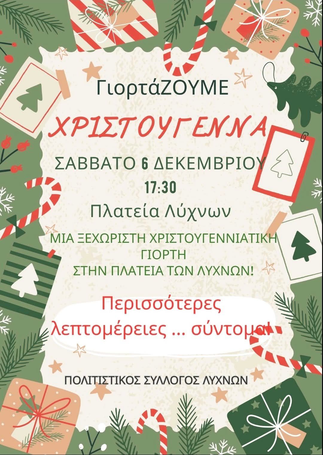 ΧΡΙΣΤΟΥΓΕΝΝΙΑΤΙΚΗ ΓΙΟΡΤΗ ΕΤΟΙΜΑΖΕΙ Ο ΠΟΛΙΤΙΣΤΙΚΟΣ ΣΥΛΛΟΓΟΣ ΛΥΧΝΩΝ ΣΤΗΝ ΠΛΑΤΕΙΑ ΤΟΥ ΧΩΡΙΟΥ ΤΟ ΣΑΒΒΑΤΟ 6 ΔΕΚΕΜΒΡΙΟΥ ΣΤΙΣ 17:30