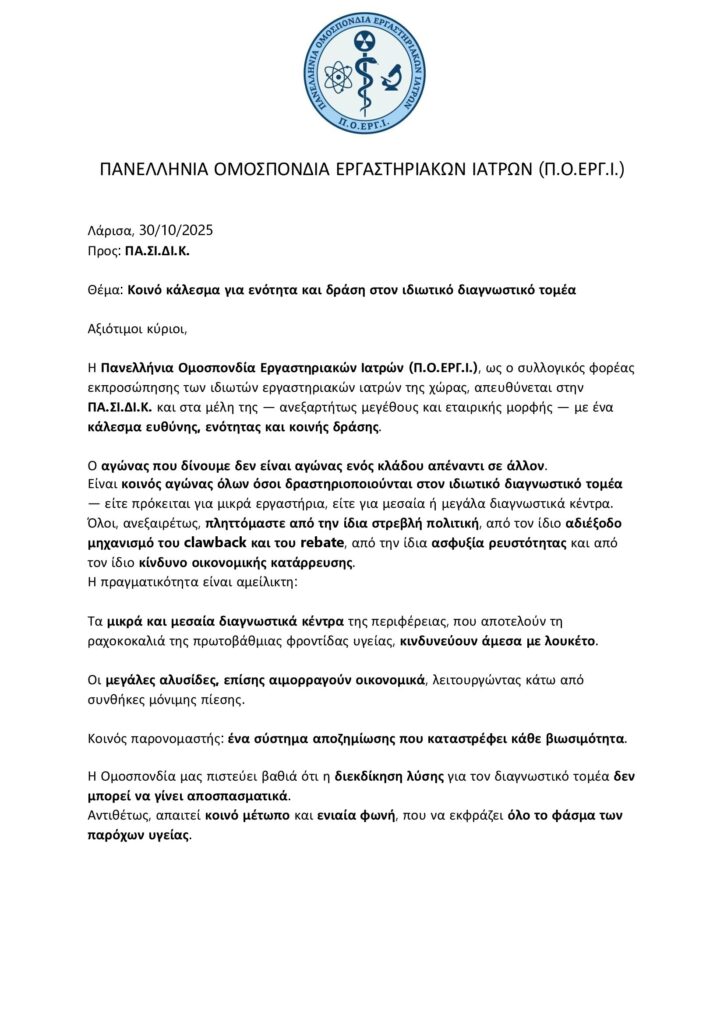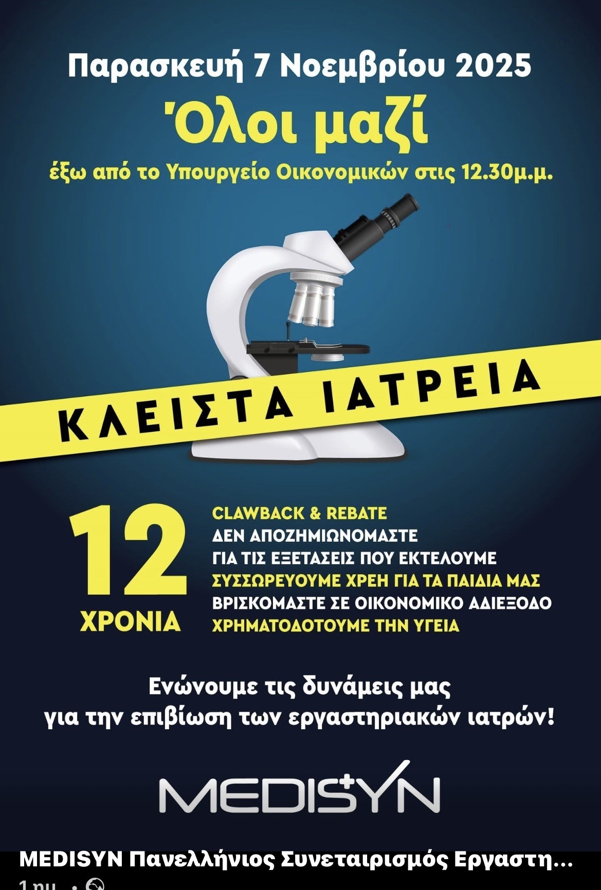 Ο Σύνδεσμος Εργαστηριακών Ιατρών Βορείου Αιγαίου ανακοινώνει τη συμμετοχή του στη μεγάλη πανελλαδική κινητοποίηση των ιδιωτών εργαστηριακών ιατρών, που θα πραγματοποιηθεί την Παρασκευή 7 Νοεμβρίου 2025 στις 12:00 μπροστά από το Υπουργείο Οικονομικών και θα ακολουθήσει πορεία προς το Μέγαρο Μαξίμου.