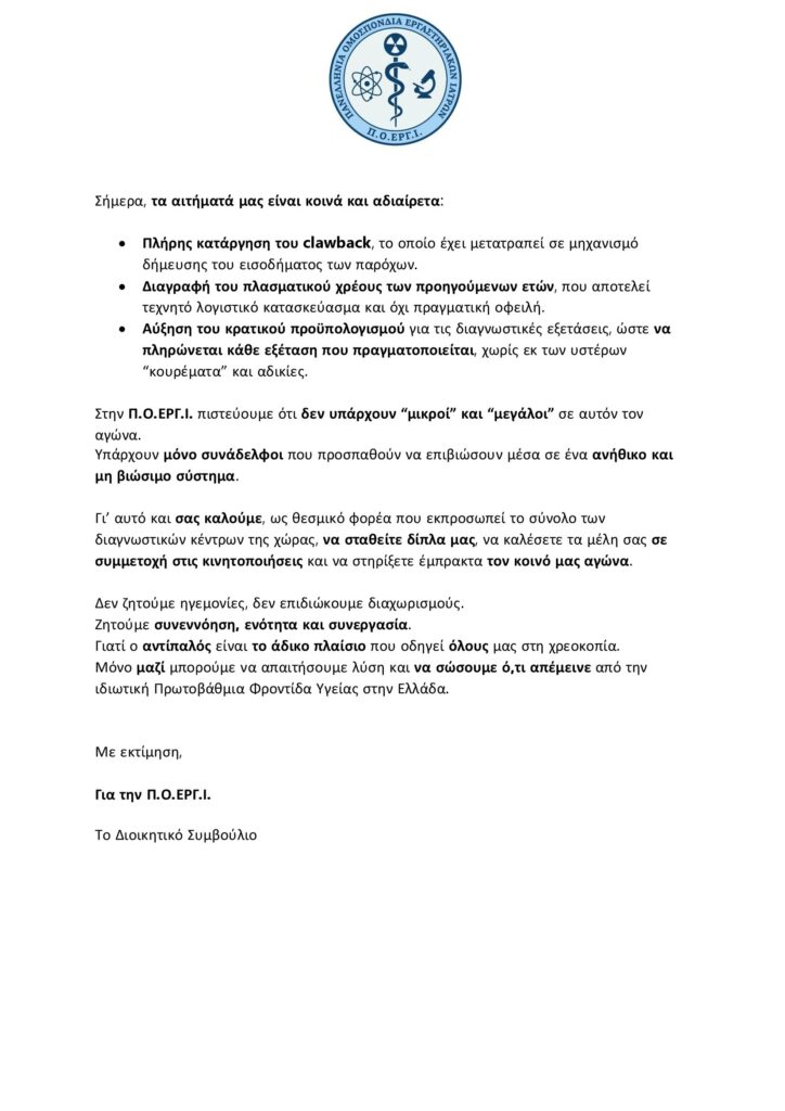 Η κινητοποίηση αυτή αποτελεί κραυγή αγωνίας και αξιοπρέπειας των ιδιωτών εργαστηριακών ιατρών, οι οποίοι στηρίζουν καθημερινά την Πρωτοβάθμια Φροντίδα Υγείας.