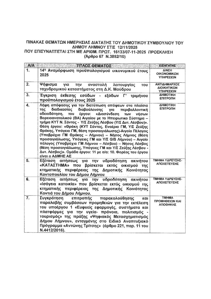 Πρόσκληση τακτικής συνεδρίασης του Δημοτικού συμβουλίου στις Τετάρτη 12 Νοεμβρίου, στις 18:30, στο Παπουτσίδειο, στην πλατεία Υψιπύλης.