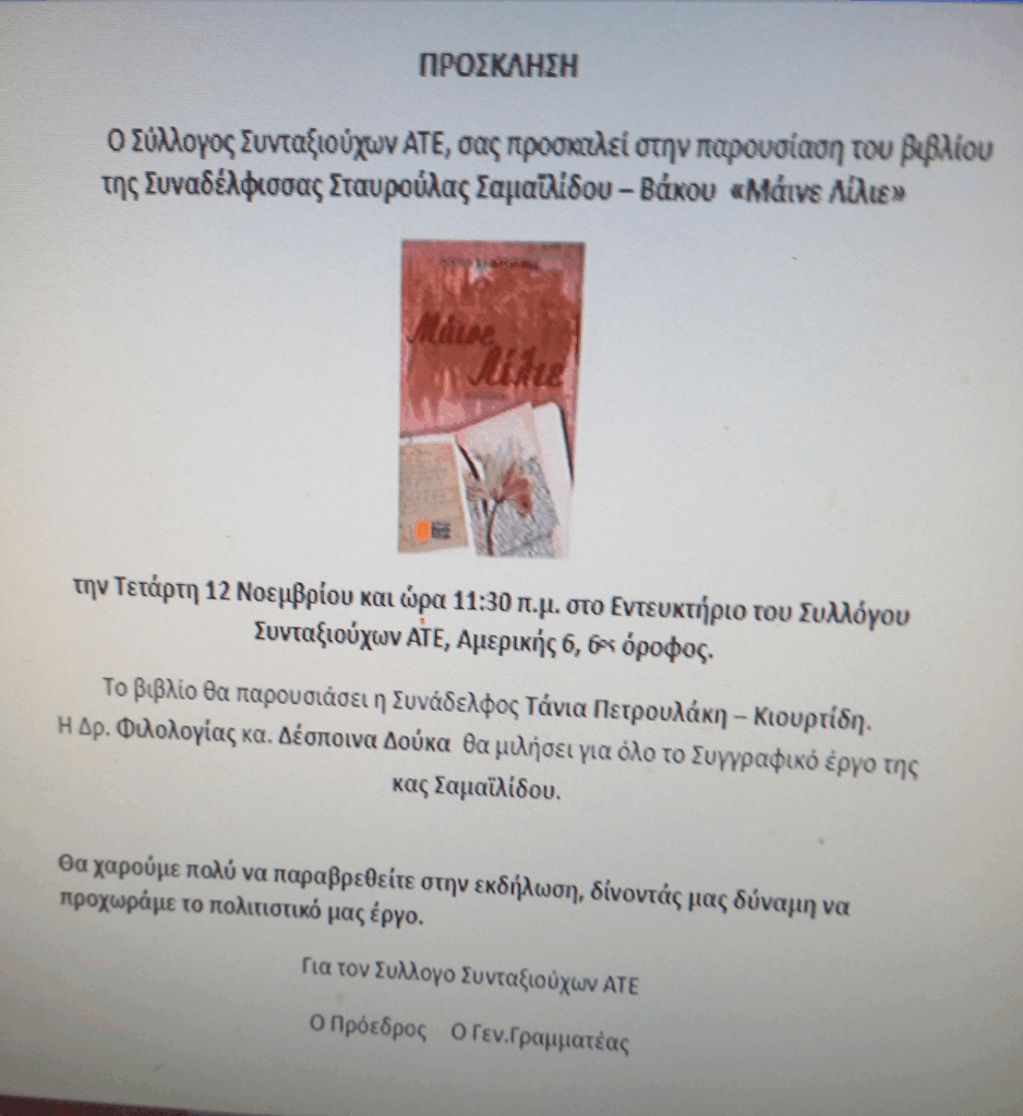 Ο Σύλλογος Συνταξιούχων ΑΤΕ, οι παλιοί συνάδελφοι της Ρούλας Σαμαϊλίδου – Βάκου μου παρουσιάζουν το τελευταίο της βιβλίο “Μάινε Λίλιε” αλλά και όλο το συγγραφικό της έργο, την Τετάρτη 12 Νοέμβρη στις 11:30 π.μ.στην όμορφη αίθουσα που διατηρεί ο σύλλογος στο κέντρο της Αθήνας (Αμερικής 6 – 6ος όροφος).