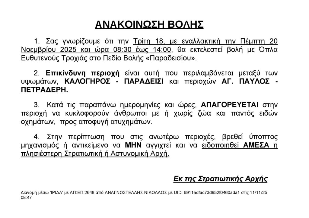 ΑΝΑΚΟΙΝΩΣΗ ΒΟΛΩΝ ΑΠΟ ΤΗΝ 130ΣΜ