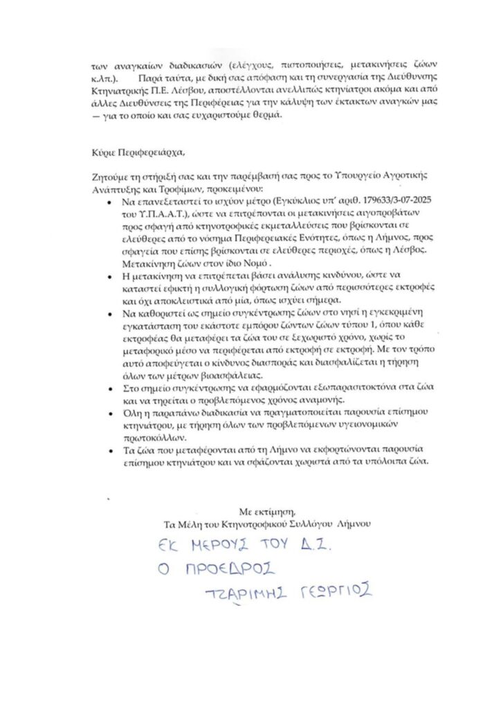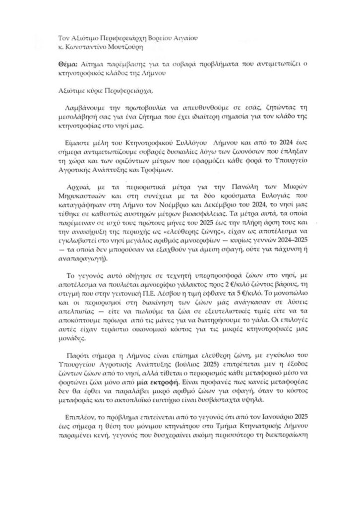 Καταθέτουμε ΑΝΑΦΟΡΑ την Επιστολή των Μελών του Κτηνοτροφικού Συλλόγου Λήμνου και του Προέδρου του Διοικητικού Συμβουλίου, στην οποία ζητούν να παρθούν συγκεκριμένα μέτρα για να αντιμετωπιστούν τα προβλήματα που περιγράφουν.