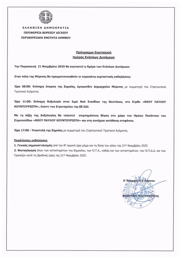 ΠΡΟΓΡΑΜΜΑ ΕΟΡΤΑΣΜΟΥ ΤΗΣ ΗΜΕΡΑΣ ΤΩΝ ΕΝΟΠΛΩΝ ΔΥΝΑΜΕΩΝ