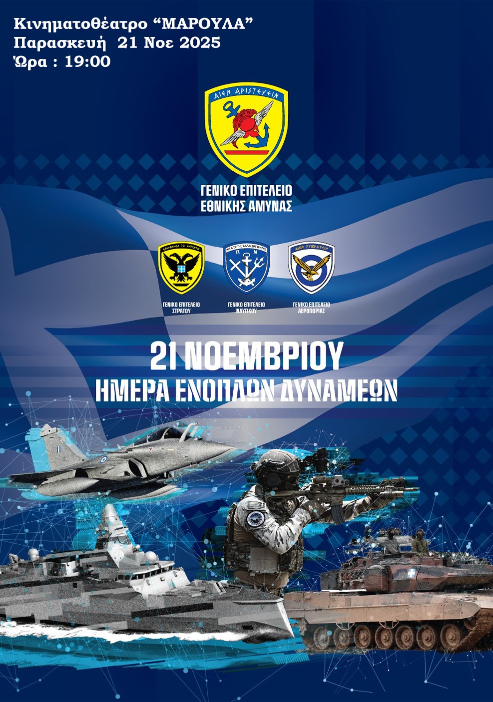 Στο πλαίσιο του εορτασμού της Ημέρας των Ενόπλων Δυνάμεων, η 88 ΣΔΙ την Παρασκευή 21 19:00 Νοε 25, έχει προγραμματίσει την διεξαγωγή εορταστικής εσπερίδας στο κινηματοθέατρο «ΜΑΡΟΥΛΑ», ώστε η ημέρα αυτή να αποτελέσει πηγή υπερηφάνειας και ανύψωσης ηθικού για τα στελέχη των ΕΔ, που υπηρετούν στην νήσο Λήμνο.