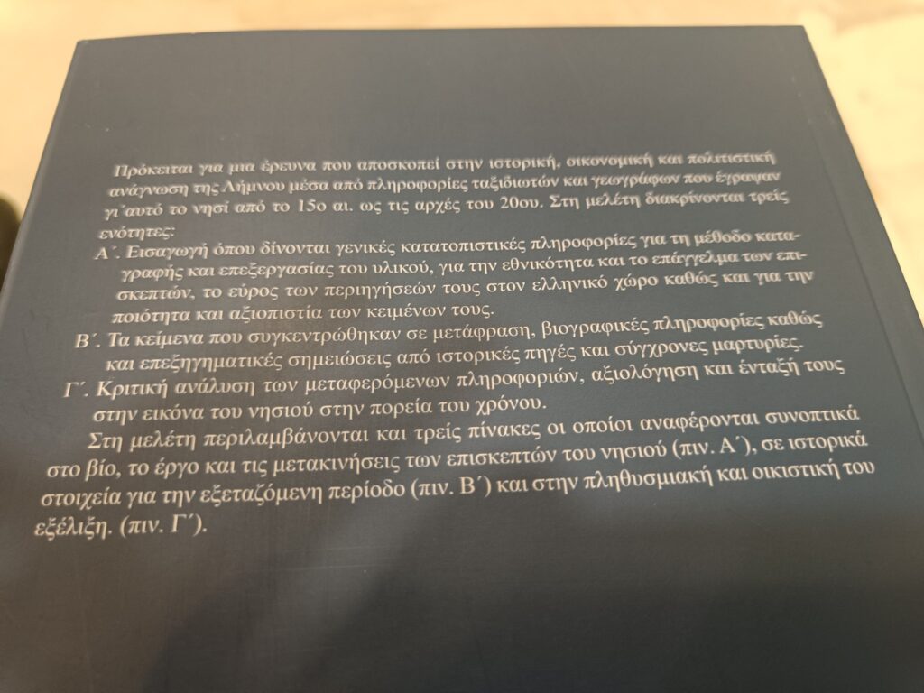 “Η μελέτη από το 1986 όταν πρωτοεκδόθηκε, αποτέλεσε για όσους την μελέτησαν, “το Ευαγγέλιο”, για την γνώση της ιστορικής διαδρομής της Λήμνου σύστημα τους αιώνες. Αυτή η ιδιότητα του ιστορικού αυτού έργου υπήρξε η αιτία που μας παρακίνησε για την επανέκδοση της και ουσιαστικά να διασώσουμε μια τόσο σημαντική πηγή πληροφοριών για το νησί μας. “