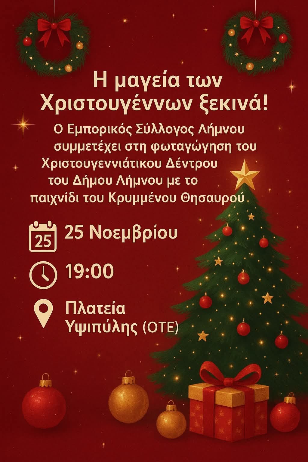 Ο Δήμος Λήμνου προγραμματίζει τη φωταγώγηση του Χριστουγεννιάτικου Δέντρου στην Αγορά της Μύρινας στις 25 Νοεμβρίου και ο Εμπορικός Σύλλογος συμμετέχει με παιχνίδι Κρυμμένου Θησαυρού!!!