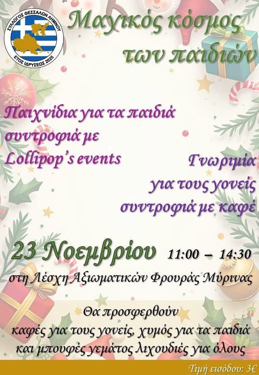 Ο Σύλλογος Θεσσαλών προσκαλεί το Σάββατο 23 Νοεμβρίου, 11:00 – 14:00, στη Λέσχη Αξιωματικών Φρουράς Μύρινας, στην εκδήλωση “Ο Μαγικός Κόσμος των παιδιών”.