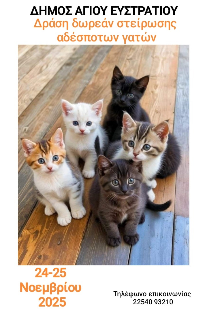 Ο Δήμος Αγίου Ευστρατίου, σε συνεργασία με την Εθελοντική Δράση Κτηνιάτρων Ελλάδας (ΕΔΚΕ), σας προσκαλεί στη δράση στείρωσης αδέσποτων γατών που θα πραγματοποιηθεί: