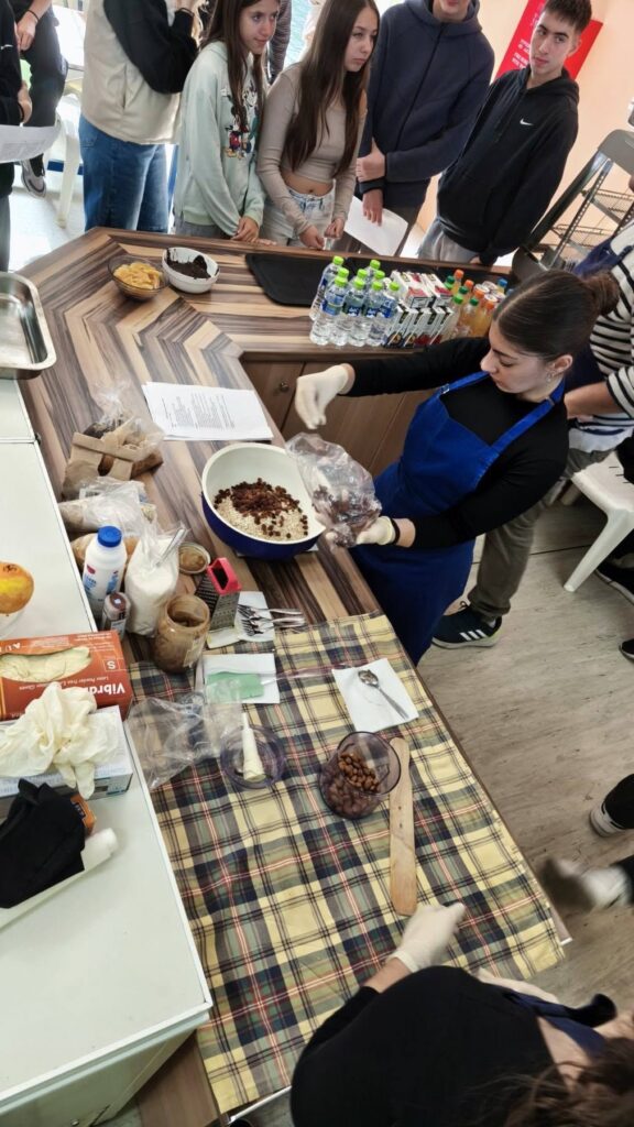 4. Τη Δευτέρα 3 Νοεμβρίου 2025 ως σχολείο κόμβος της Δράσης συνεργαστήκαμε με τη ΣΑΕΚ Λήμνου και τον εκπαιδευτή κ. Γιώργο Κιουρανάκη, ο οποίος, με τη σύμπραξη εκπαιδευομένων, έδειξε συνταγή για υγιεινό πρωινό, το οποίο παρασκεύασε μαζί με τα παιδιά και των τριών τάξεων του σχολείου. Συγκεκριμένα φτιάξαμε μαζί υγιεινές μπάρες πρωινού και τις καταναλώσαμε στο διάλειμμα! Ευχαριστούμε πολύ τη διευθύντρια της Σχολής Ανώτερης Επαγγελματικής Κατάρτισης Λήμνου κ. Ιουλία Λυγδά και τον κ. Κιουρανάκη με τους/τις εκπαιδευομένους/ες του για την άψογη συνεργασία! Ευχαριστούμε, επίσης, την κ. Θεοδοσία Καλημανά, που διέθεσε τα μέσα στο κυλικείο για την υλοποίηση της δράσης! Η Δράση υλοποιείται με τη σταθερή υποστήριξη του Department of Food Science and Nutrition – UoA Τμήματος Επιστήμης Τροφίμων και Διατροφής του Πανεπιστημίου Αιγαίου. Ευχαριστούμε πολύ για τη συμμετοχή όλων!